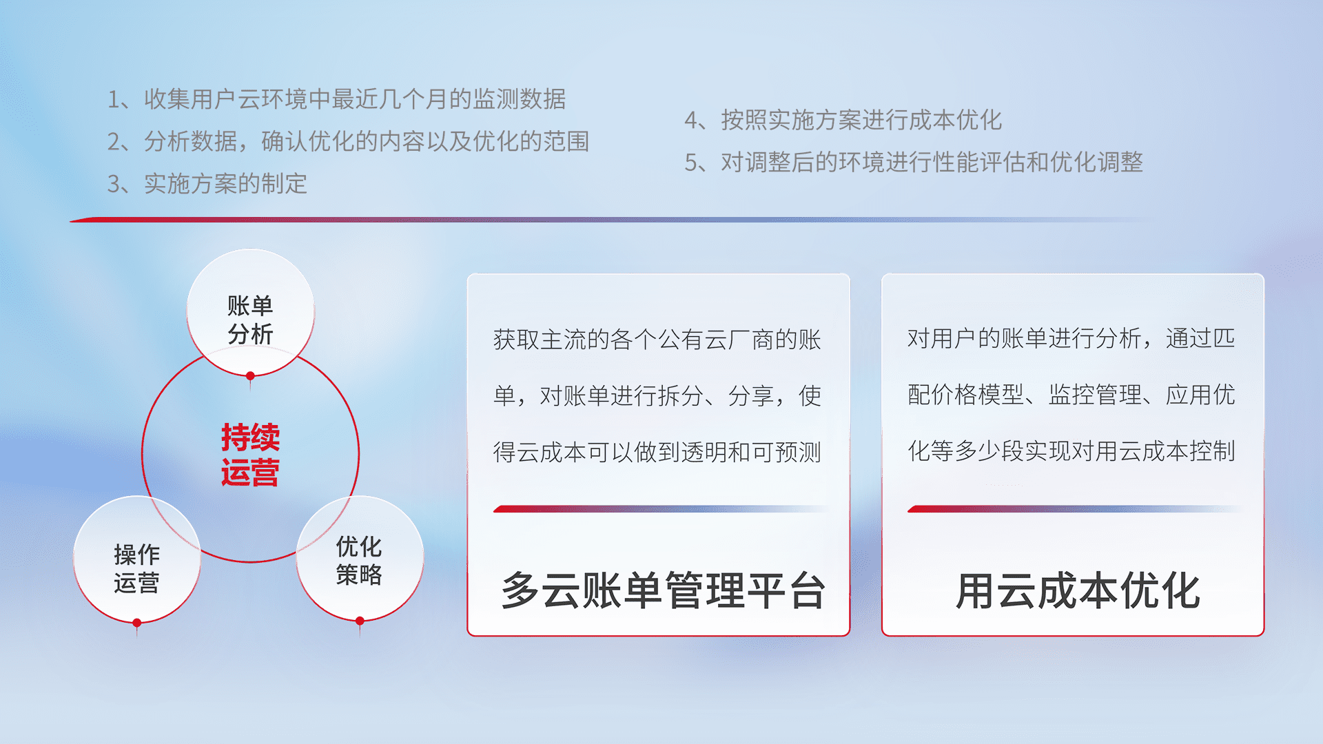 通过多云纳管,,以统一的资源数据模型把客户的云资源进行抽象和封装,,,进而实现对多云资源的统一操作,,,保障云资源管理的可靠性、、、、稳定性与可用性。。量身定制化运维内容,,配置、、、开发运维、、、、补丁管理、、、、备份、、监控、、、认证和访问管理、、、、审计和日常巡检等,,,,保障在用云过程中的可靠度,,稳定度以及高可用率。。。